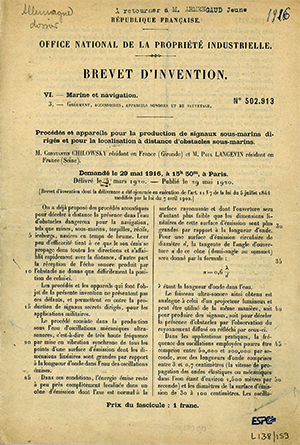 Le principe consiste à repérer un sous-marin par l’émission d’un signal sonore suivie de la réception de l’écho provoqué par une réflexion sur la coque du submersible. Après dix-huit mois de recherches à un rythme effréné, le brevet Langevin-Chilowski utilisant les ultrasons est déposé en mai 1916. Mais la contribution majeure de Langevin sera le choix de la piézoélectricité et la mise au point d’un émetteur-récepteur utilisant un triplet acier / quartz / acier, qui sera breveté en 1918. Des expériences en mer auront lieu en février et novembre 1917 et les premiers essais devant les autorités militaires, à Toulon en avril 1918.