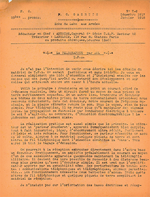 Entre 1917 et 1919, 17 numéros d’un journal interne intitulé « PC Gazette » vont être imprimés par les élèves, sous l’impulsion d’Antoine Gravière, Jean Langlois et Robert Caillas. D’abord adressé à la 33ème promotion dont ils sont issus, le journal s’élargit aux promotions 31 à 39. À travers ces numéros, chacun peut avoir des nouvelles de ses camarades, qu’il soit question d’affectation, de récompense, comme de nouvelles plus tragiques. La gazette est également le lieu de nombreux échanges scientifiques et techniques, permettant à chacun de se tenir au courant des découvertes et améliorations réalisées en temps de guerre. Pendant ces années, ils vont aussi et surtout entretenir les liens qu’ils ont tissés à l’École, s’échangeant des informations sur les cours, des nouvelles diverses ainsi que des chansons sur PC.